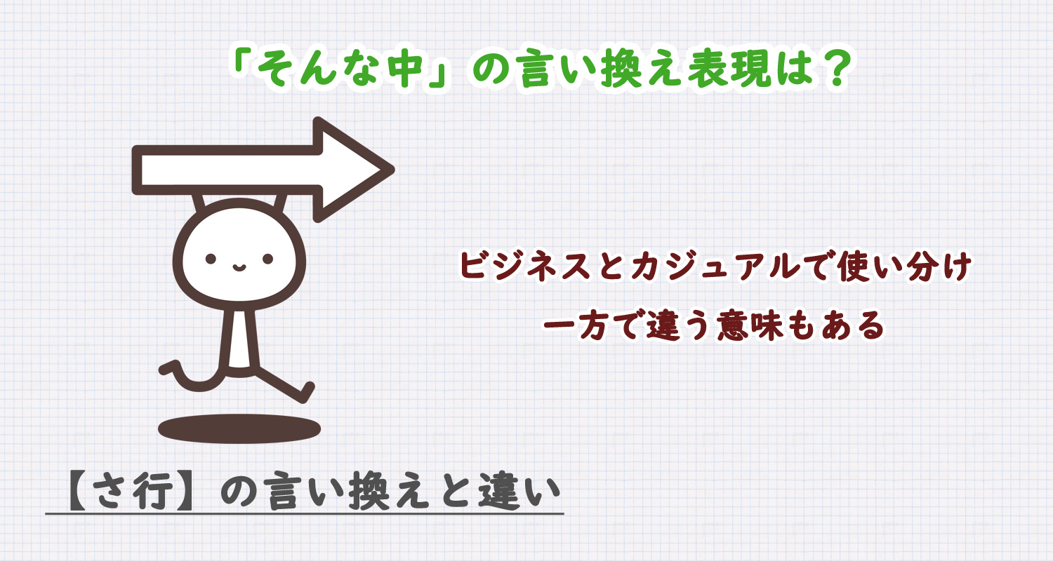 日常的な会話でフランクに使える言葉で、「そんな中」と同じく状況を指す際に適しています。